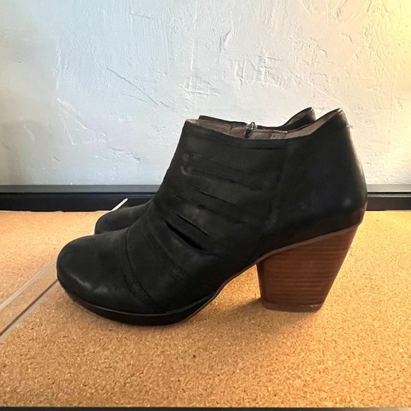 Cute, comfortable stacked heel ankle boots. Very gently worn. Size 40 (US 10). Leather upper. Zip closure. Heel height: 3 inches. Mild platform sole.