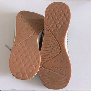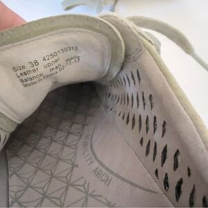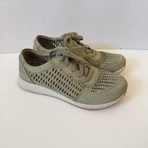 These Dansko sneakers showcase a light green color and feature a breathable, perforated material that enhances ventilation. The white soles provide a stylish contrast and are designed for comfort and support, making them perfect for casual outings. Very good preowned condition gently used, some marks,scratches on the leather,dirt on the sole with minor signs wear on it.