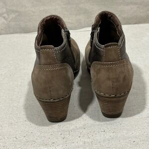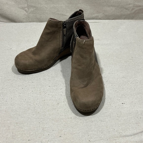 Keywords: Dansko boots, leather ankle boots, wedge boots, zip up boots, brown boots, women's footwear, fashion boots, casual boots, European size 37, distressed leather, booties