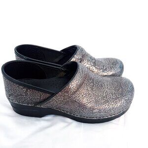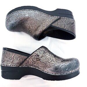 Dansko Professional Tooled Leather Clogs are accepted by the American Podiatric Medical Association (APMA). Designed for comfort and support from roomy toe box to contoured midsole to protective heel counter. Leather sockliner. The rocker bottom keeps you moving, fights fatigue. Pretty tooled emossed gunmetal silver gray/grey foliage print.