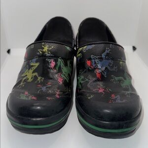 Dansko Vegan Valley Coated Canvas Comfort Clogs Frog Print Women’s EU Size 37 US Size 6.5-7. Slip on, multicolored frog print, rubber toe cap and trim, classic anti-fatigue rocker bottom, great tread. Good condition!