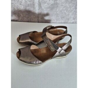The Dansko Vera Sandals in Metallic Pewter are a stylish and versatile option for women's footwear. Featuring a peep toe design with an adjustable strap, these sandals offer comfort and breathability for casual or workwear occasions. The low wedge heel and lightweight leather construction make them perfect for summer, fall, or spring seasons. The strappy style and silver color add a touch of nature-inspired charm, while the bohemian and hippie themes make them a trendy choice for various outfits. Made by Dansko, these sandals are a reliable and fashionable addition to any wardrobe. Has light scuffing around the bottoms. See photos!!!