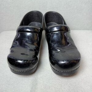 These Dansko Professional clogs feature durable black leather with a subtle dark purple undertone, designed for all-day comfort and support. Classic slip-on style with a roomy toe box and contoured footbed. Size EU 41 / US 10.5–11.