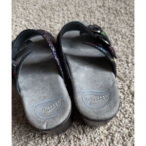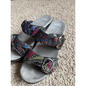 Excellent used condition. Dansko Women's Black Rainbow Mosaic Sophie 2 Band Heeled Sandals Size 36. Heel height 2in.