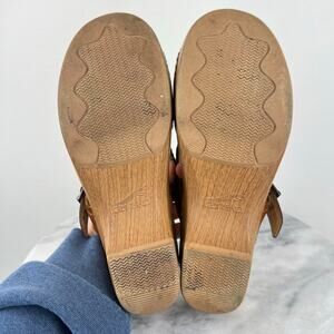 Dansko Women's Brown Genuine Leather Open Toe Comfort Sandal Clogs. Originally labeled a size 40 EU, but fits like a size 9.5. In good used condition, some wear along the footbed and does have a black mark along the side as shown in the photos. Cutout genuine leather upper with adjustable buckle. Chunky clog soles for all day comfort. 2.25" heel and 1" platform. Comfortable and fashionable.
