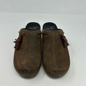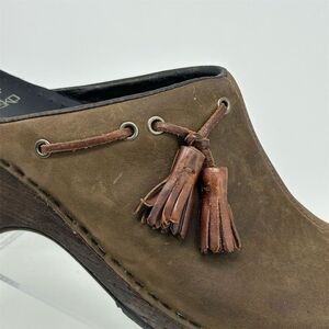 Keywords: Dansko mule clogs, brown leather clogs, women's casual shoes, slip-on clogs, tassel detail shoes, sturdy wooden sole, pre-owned Dansko, size 8.5-9 US, size 39 EU, closed toe mules, women's leather footwear, casual slip-on shoes, comfortable clogs, women's brown mules, leather slip-on clogs.