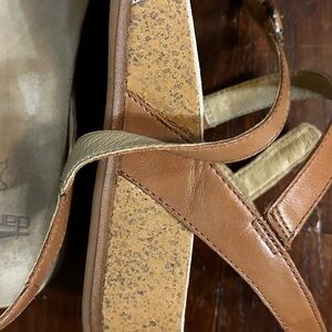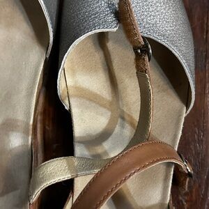 Step out in style with these chic silver and tan sandals. Perfect for any occasion, these shoes offer both comfort and elegance.