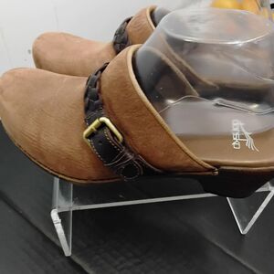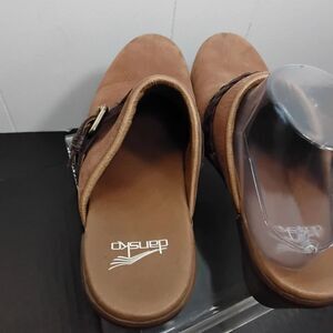 Step into comfort with Dansko's stylish tan leather clogs. Perfect for everyday wear, these shoes feature a woven strap for added flair. has normal wear
