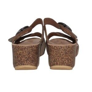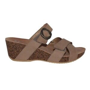 Dansko Women's Taupe Milled Nubuck Leather Susie Wedge Sandals in size 39 (US 8). Mid heel height 2 1/2" heel and a slip-on style. Leather lining and upper material, with a rubber outsole. The hook and loop closure.