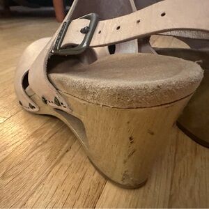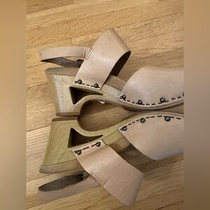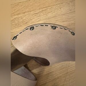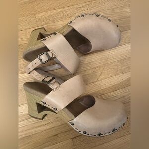 Cream colored studded clog sandals. There is wear on the toe and the heel as shown in the photos