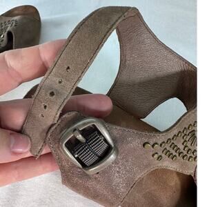 Dansko Womens sz 40 Deandra Studded Taupe Shimmer Sandal Block Heel BOHO T Strap