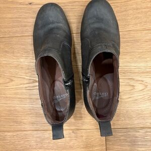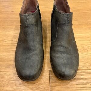 Dark gray leather Dansko size 40 ankle boots with a 1.5" heel. Good condition with light wear.