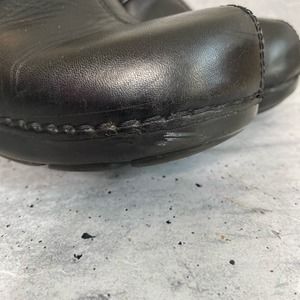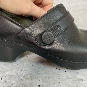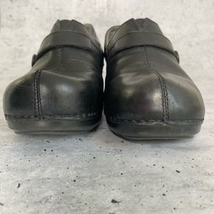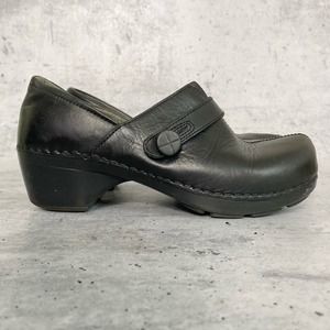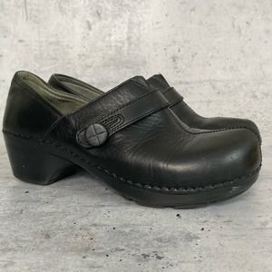 Dansko black leather button detail clog. Classic Dansko style with a cute button & strap detail. There is a little wear at the toe and on the sole- seen in pics. Heel is about 1.5in