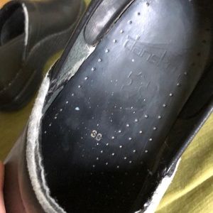 Pre-owned black leather dansko’s. Size 38. They are scuffed up and does have peeling around the top area. Very comfortable, bottoms are in good condition. Still have life left in them.