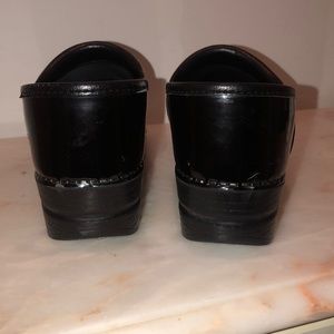 Black patent dankso clogs. Some signs of wear. Comfortable. Still plenty of wear left. Great made shoes for errands, nursing, around the house/garden.