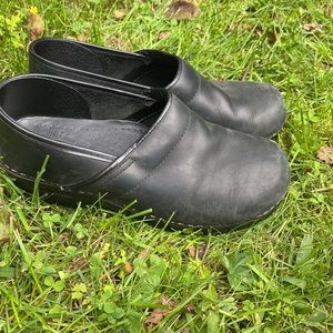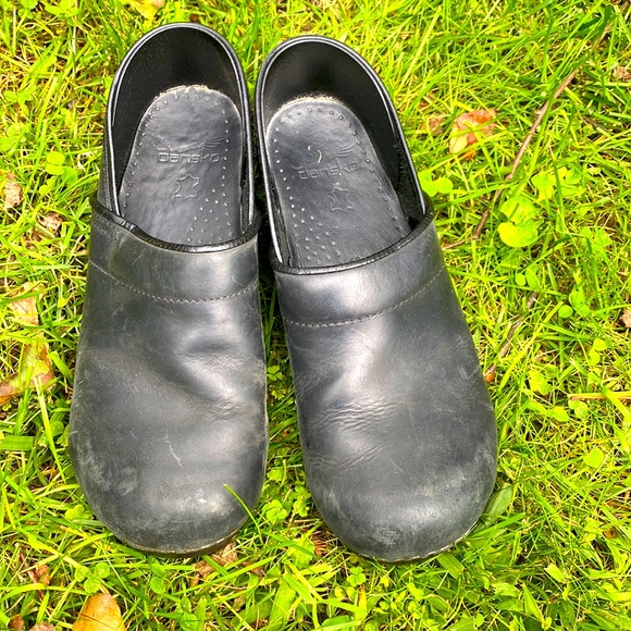 Dansko clogs, worn a fair amount but still have a lot of life left in them and the soles are in excellent shape. Scuffing on toes, as shown in pics, but can probably be improved with a little TLC. If you stand a lot for work, these are excellent for you!