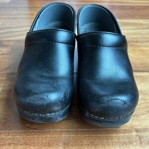 Cute black leather Dansko clogs. Some scuffs but still lots of life left. Super comfortable.