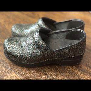Dansko nursing clogs, size 37. Very pretty optical design with iridescent reflection. These are used but have tons of life left. Some creasing and wear and tear as evidenced by photos.