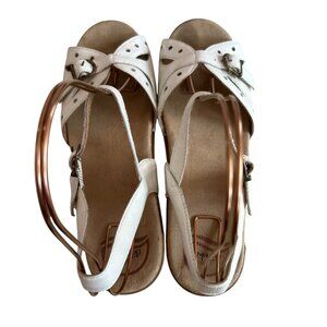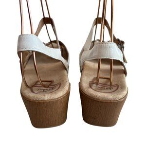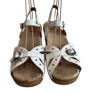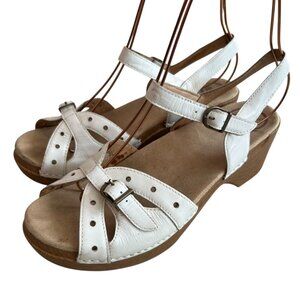 Dansko Sissy sandals, white patent leather with perforations, wrap around ankle strap, buckle closure, faux wood platform and block heel, 2.25" heel, EU 41 / US 10.5-11, preowned and shows wear on the soles, discoloration on the lining and leather - see photos