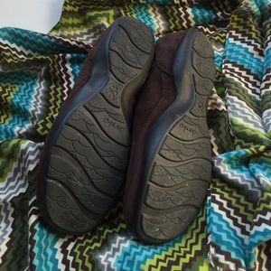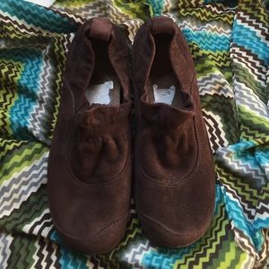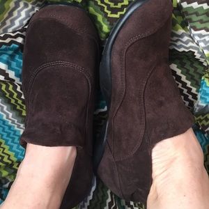 Brown Dansko shoes size 39 but fits more like an 8. Slip on style. Elastic for comfort around top of foot. Leather upper, balance man made. Soft brown material. Worn twice. Purchased from Nordstrom Rack. Tags were stuck inside of shoe and I wasn't able to get all of it out. Purely cosmetic and can't see when wearing.