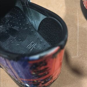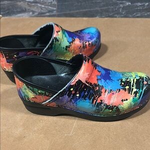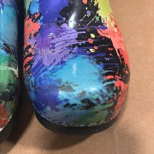Vibrant Dansko clogs with a colorful splatter design. Perfect for adding a pop of color to any outfit, or pair of scrubs. I used these for nursing and they received plenty of wear, but the colors still pop. Size 38, and I wear an 8 1/2 shoe. They are broken in. Some flaws on the top where it hits the top of your arch (see pictures) left clog is more worn in this area than the right clog. And the left clog is worn in the back at the level of the ankle. (Please see all pictures) Insides and soles are in great shape.