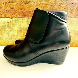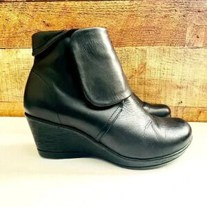 Leather upper/Manmade sole. Shaft measures approximately 5.5" from arch. Heel measures approximately 2.5". Platform measures approximately 0.75". Wedge boot with adjustable, wraparound shaft featuring folded flap at ankle.