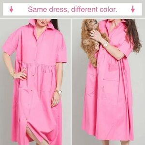 Style Description: Generously cut, poplin cotton shirt dress - meant to be voluminous | Button front | Removable fabric tie-waist belt - wear belted or unbelted | Fold-down collar | Midi length | Short sleeved | Patch pockets on front side of skirt | Made in Italy