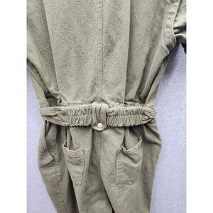 This olive green jumpsuit combines utility and style, featuring a belted waist, elastic back, and comfortable cotton material, ideal for polished casual wear.