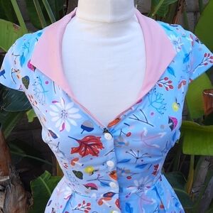 Dapper Day size extra small First First Collette Pinup Dress blue leaf print. Vintage style. Full button front. Cap sleeves. Box pleats. Excellent pre-owned condition. Smoke free pet friendly home. Please see pictures for measurements. Please note NO BELT. Pinup vintage style dress Dapper Day First Frost Collette Pinup Dress extra small