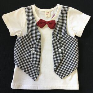 Top: Crisp white short-sleeved shirt featuring a playful faux vest design on the front, giving the illusion of layered sophistication without the fuss.