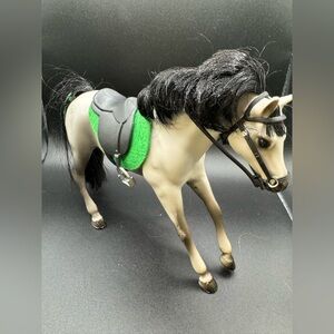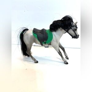 This horse is preowned and shows signs of use from play in the form of paint rubs and scratches (examine pictures carefully). No longer has sound. Always a smoke-free home. Sturdy, heavy plastic—not like most toys today. Approx 6” tall. Comes with saddle and bridle.