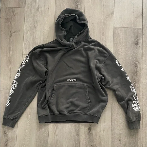 Authentic Darc Sport hoodie featuring the WOLVES branding on the chest and bold wolf graphics down both sleeves. Heavyweight, comfortable, and broken in perfectly — this one’s got that lived-in Darc Sport feel people actually want.