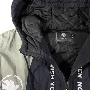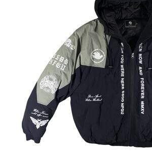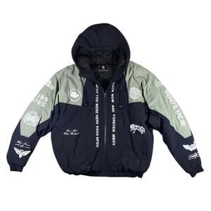 Full zip front with multiple graphics throughout, side pockets, adjustable hood, oversized fits like a large.