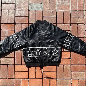 The Darc Sport WOLVES Black Varsity Jacket is a stylish and limited edition piece perfect for sporty men. Made of polyester, this jacket features a classic black color with a varsity style design, making it a versatile and fashionable option for casual wear. With a size large and only 500 units available, this item is a unique addition to any wardrobe, showcasing a blend of sporty flair and urban style.
