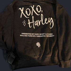 Limited collab between Darc Sport and DC Comics featuring a hyper-detailed Harley Quinn portrait on the front and “XOXO, Harley” lettering across the back. Ribbed cuffs and hem, soft fleece interior, and signature wolf embroidery.