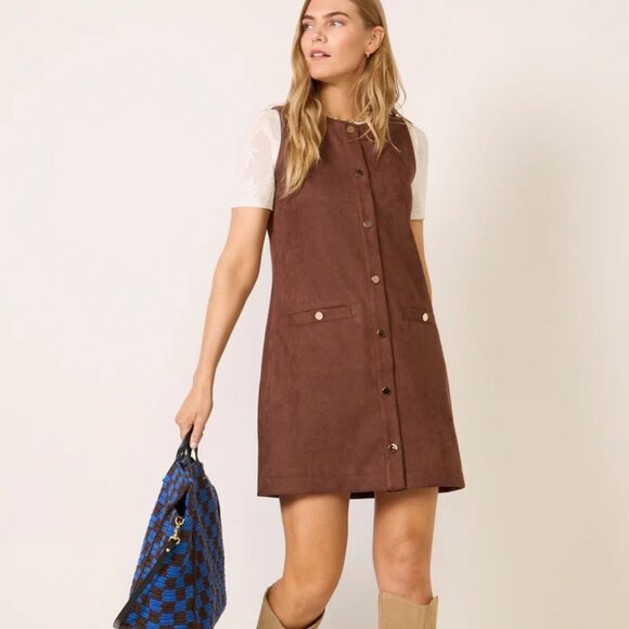 Flattering and oh-so-chic, the Darcy faux suede dress by EVEREVE features a mini silhouette with a crew neckline, gold button details, and front pockets.