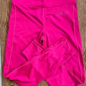 Dare2B hot pink wide waistband leggings with small waistband pocket, size 6. Tonal stitching details, approximate measurements are waist flat 13.5”, waistband 3” wide, rise approximately 10”, inseam approximately 28”.
