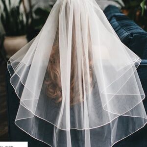 Classic and refined, this two-layer veil is finished with a delicate pencil edge for just a touch of definition. The top layer can be worn as a blusher or left back for a soft, layered look.