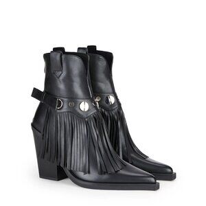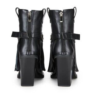 cuz your way or the highway. These ankle boots have a vegan leather construction, a pointed toe design, block heels, fringe detailing, decorative studs, and back zipper closures.