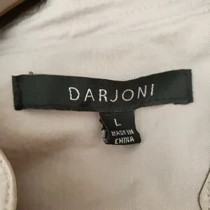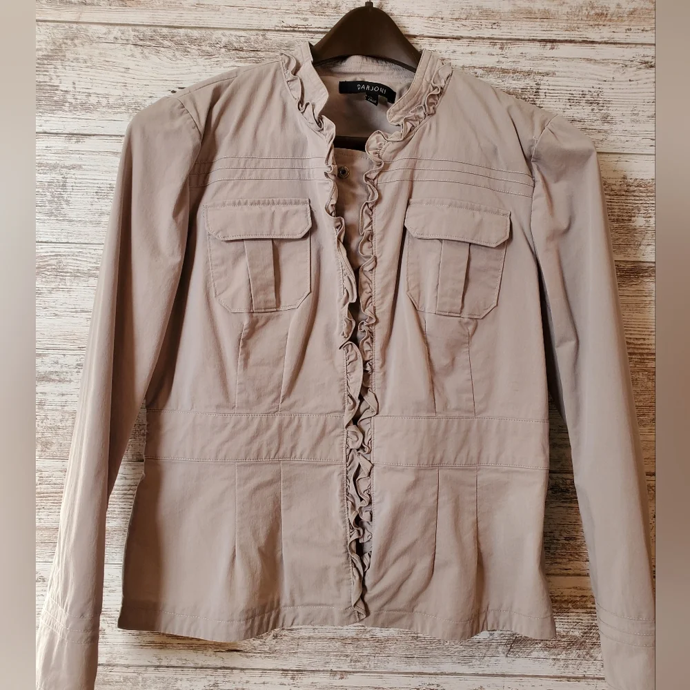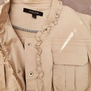 Darjoni women's utility jacket/blazer featuring a ruffle front and snap-button closure.