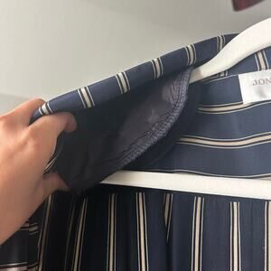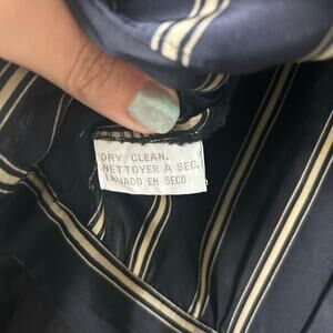 Stunning Jones New York 100% Silk Dress. This is a wrap style ankle length dress Dark academia style perfect for a dress to impress event. Pin stripe detail, perfect V neck collar, and inside shoulder pads for added support and shape. ***Button Flaw, the inside wrap button is loose and will need tightening for secure closure.