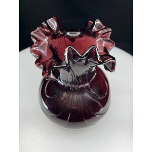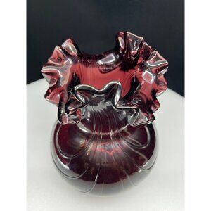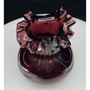 Dark Amethyst Fenton 8” Tall Art Glass Vase Etched Contour Rings Ruffle Edge