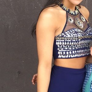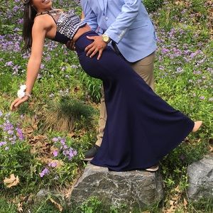 jeweled dark blue top with a dark blue skirt including a slit on the left side, only worn once & new quality