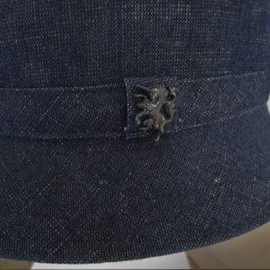Haute couture bucket trilby unisex hat made from cotton dark blue denim fabric with gray satin lining.