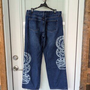 Worn twice, looks brand new. No rips or stains, or visible loose threads. Dark blue denim with discharge printed snake designs on sides.