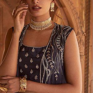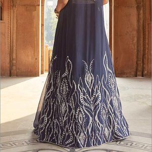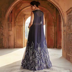 Featuring a navy blue duster jacket in mesh base with curvy lined hand embroidery. It is paired with a matching georgette belted lehenga and a tussar blouse having boota embroidery. The blouse and skirt both have hidden zippers.