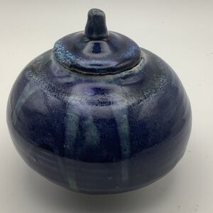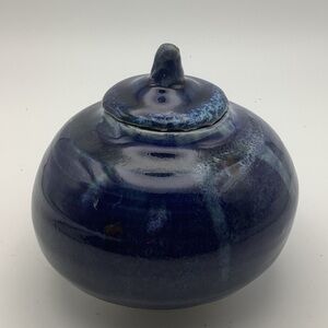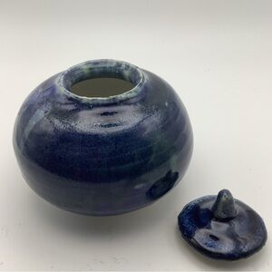 Round dark blue pottery lidded bowl/container. Handmade. Pre-owned, good condition.