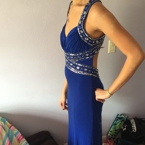 This Prom dress has only been worn to one prom night event. It had beading down the backs and on the straps. I am 5"8 and the dress is perfect length. It was a little too low cut for me in the front since I have a small bust, so there's one spot where it's been sown. But it can always be taken out. Just like new! :)
