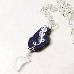 The large stone slab is a deep midnight blue Sea Sediment Jasper piece, that has 3 clear Quartz droplets suspended above the surface. I suspended a Quartz Moon as the dangling charm piece and used silver plated jewelry wire to pull it all together and to create the bail. The 24" large link, silver plated chain is hardwired into the bail, but freely adjustable if you need it a touch shorter - simply hook the lobster claw clasp into any of the links to adjust the length.