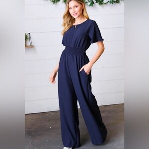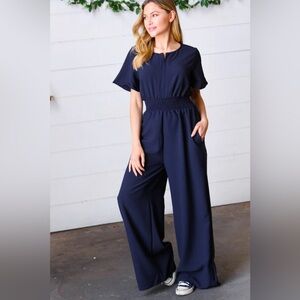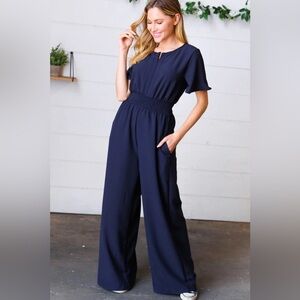 Dark Blue Smocked Waist Notch Neck Crepe Jumpsuit